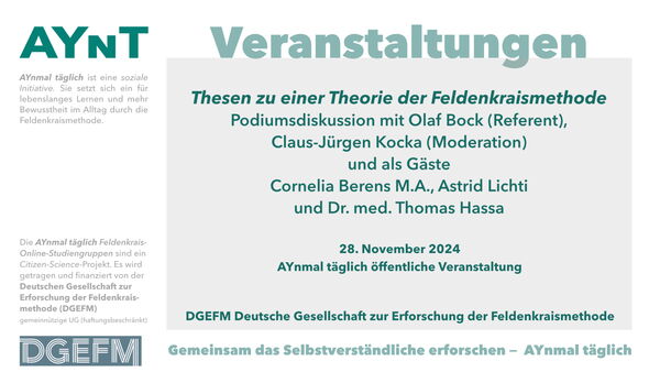 In diesem öffentlichen Vortrag stellen Olaf Bock und Claus-Jürgen Kocka die Thesen zu einer Theorie der Feldenkraismethode vor, die Olaf Bock aus den Antworten auf die interne Umfrage zur AYnmal täglich-Praxis gesammelt und ausgewertet hat. Die Impulse und Anregungen der Diskutanten Cornelia Berens, Astrid Lichti und Thomas Hassa und der Teilnehmenden werden in die weitere Planung dieses zentralen Forschungsvorhabens einfließen.